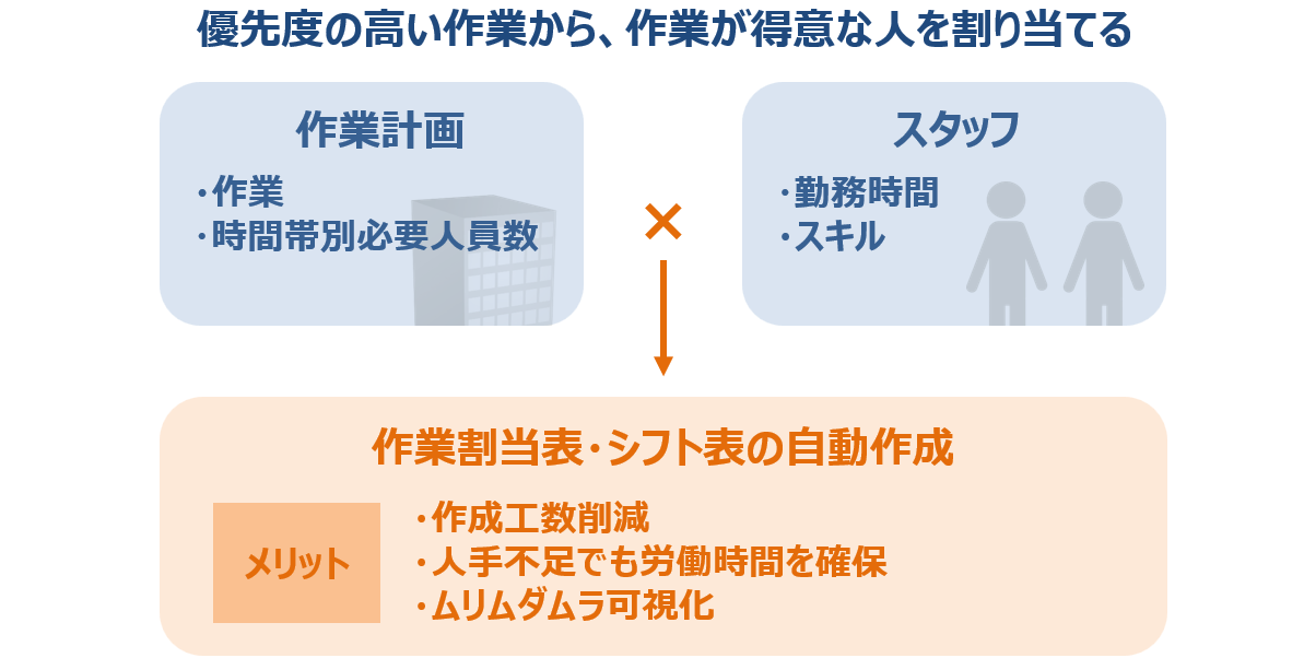 作業計画とスタッフの能力・勤務条件とを連動させ、作業割当表を自動で作成できるので、作業割当の作成時間の削減が可能。 本部から作業割当に関する数字や作業割当表が見えるようになります。