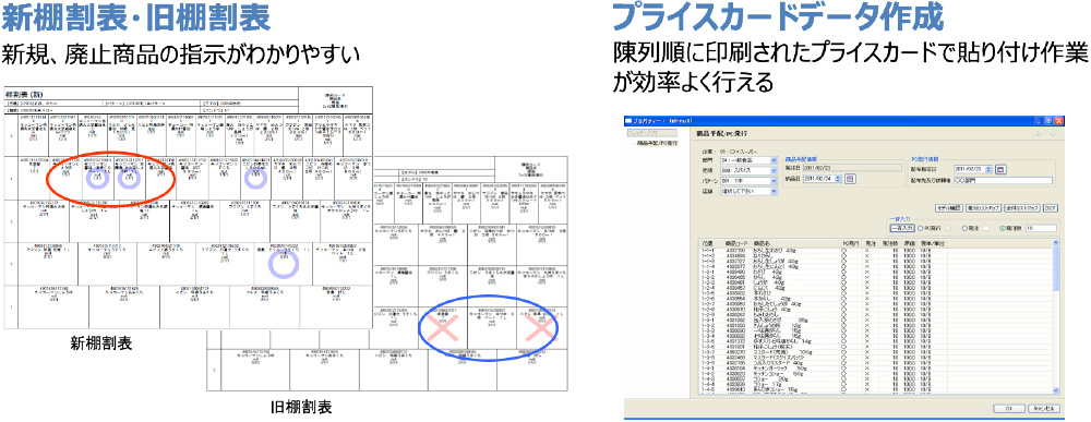 ●棚替指示書、陳列順に印刷されたプライスカードの活用により簡単に指示通り作業できます