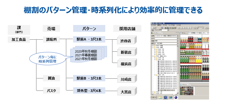 ●店舗別・パターン別・時系列の細かな棚割管理で多数の店舗を最小限の作業で管理できます